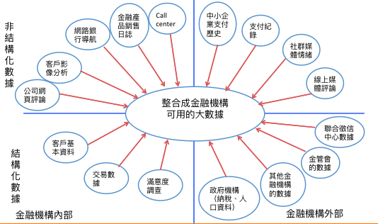 如此圖所示,需要的大數據有企業內跟企業外的,有原本資料庫格式化的資料、有半結構化的網頁內容、有攝影機攝影下來的客戶影像資料,還有客戶打電話來抱怨的客訴語音檔。這些都是很好的大數據依據,可以發揮很大的價值。而上圖顯示其中最難取得的資料,就是途中右上角的金融機構外部的非結構化數據:支付紀錄、社群群體情緒、線上評論及中小企業支付歷史:玉山銀行不論是在舊有信用卡支付的支援,或是手機行動支付的支援,加上前段提到的臉書和台灣各大BBS的資料擷取與分析,可以看出,玉山銀行能蒐集到比別家銀行更齊全的數據資料。