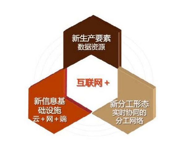 「互聯網+」把移動互聯網(台灣叫行動網路)、雲運算、大數據、物聯網全部包含在新基礎設施「雲+網(路)+端」的架構,利用大數據找出顧客需求成為新的生產要素,而重點是透過互聯網的溝通達到分時協作的目的。也就是說,「互聯網+」是透過網路整合所有雲與端:端的部分,包含智慧型手機、平板電腦、筆記型電腦連線的App及物聯網的相關裝置,而雲的部分包含雲端運算提供的服務及大數據的分析。而「互聯網+」後面的連結其實包羅萬象,「互聯網+金融」就成了「互聯網金融」,「互聯網+醫療」就成了「智能醫療」,「互聯網+農業」就成了「智能農業」,「互聯網+零售」就成了「零售4.0」,「互聯網+物」就成了「智能聯網」…等等。