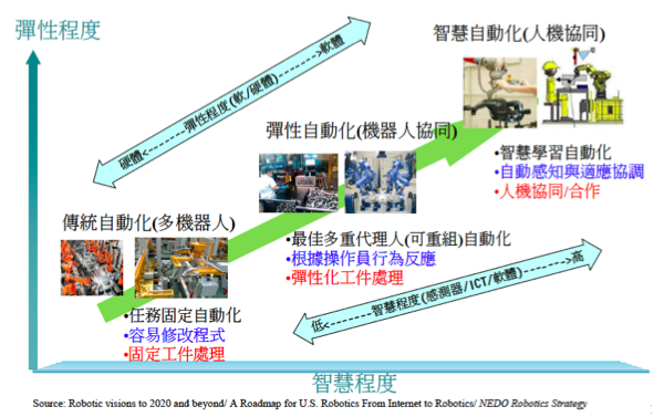 [生產彈性的趨勢]在ICT科技主導的物聯網時代, 工業機器人連上網路, 配合雲端, 讓生產更有彈性, 已經是現在新一代的趨勢, 而機器人越來越多的功能, 讓我們的生活更豐富, 我相信在不久的未來, 像星際大戰的C-3PO及R2-D2的服務型機器人將環繞在我們身邊, 而多拉A夢這樣的故事, 將不只是在漫畫裡面, 而會成為我們生活的一部分。